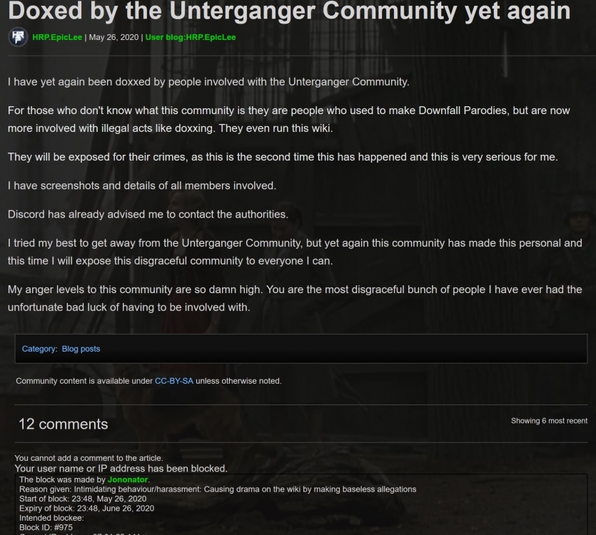 Blocked from the Hitler Parody wiki to complain about doxing
